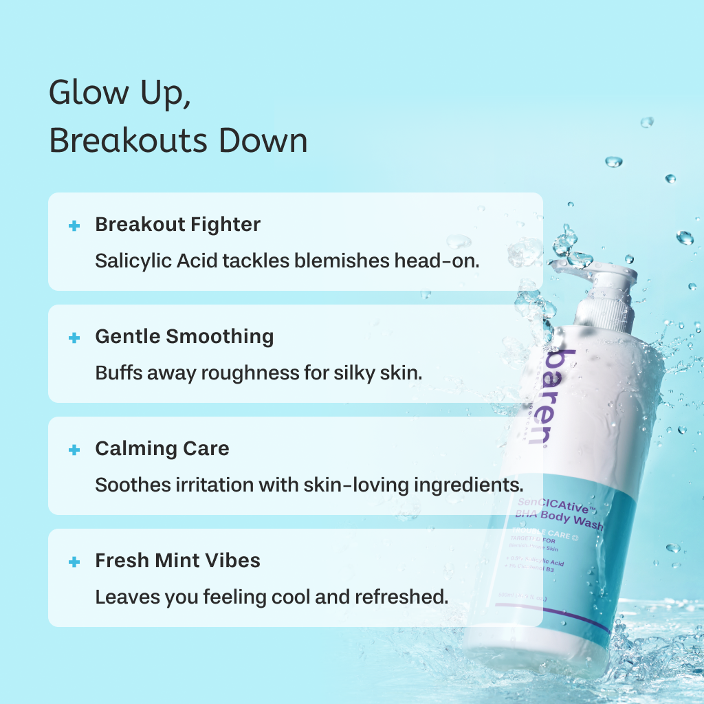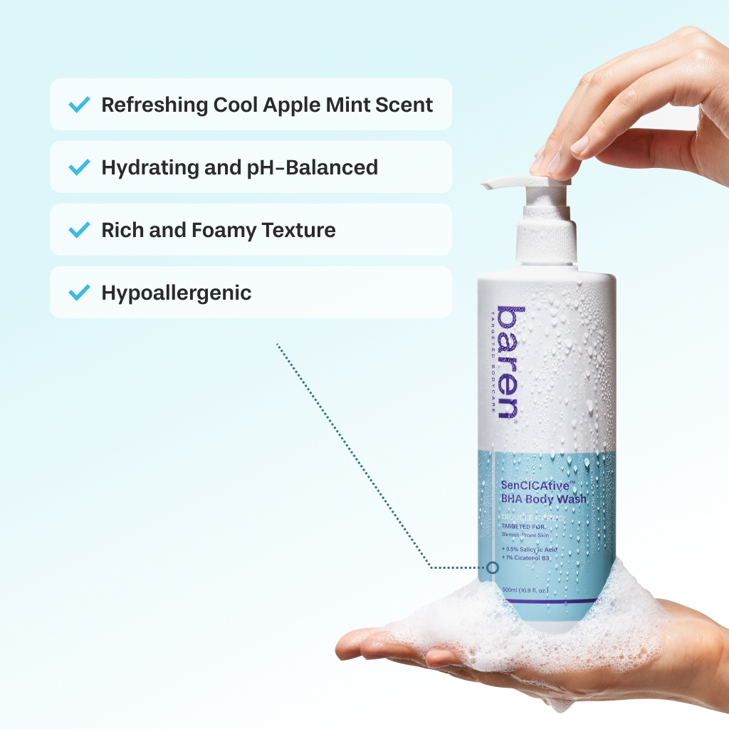 Experience a transformative approach to bacne care with this invigorating body wash, crafted to deliver a comprehensive solution for smooth, clear, and healthy skin. Combining the power of advanced exfoliants and soothing ingredients, it works to deeply cleanse pores, gently remove dead skin cells, and provide lasting hydration. Infused with salicylic acid to combat breakouts and the Cicatennol B3 Complex to calm irritation and fortify the skin barrier, this formula not only treats existing blemishes but also prevents future ones. With a refreshing minty scent and a rich, foamy lather, it leaves your skin feeling cool, revitalized, and balanced after every shower. Designed for all skin types, especially those prone to sensitivity, this low-pH body wash nurtures your skin while targeting rough texture, uneven tone, and stubborn acne for a confident, glowing result.