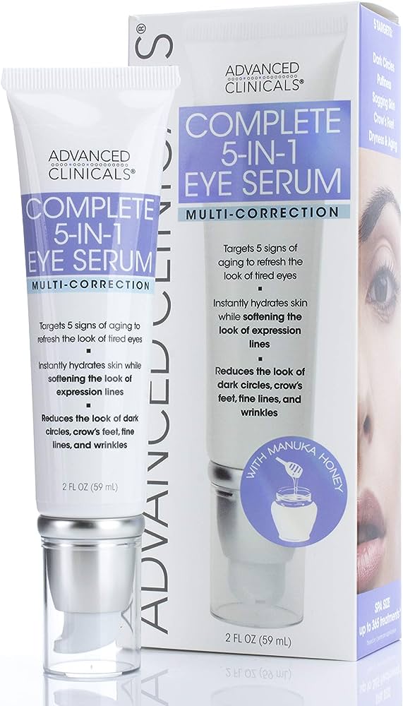 Advanced Clinicals 5-in-1 Multi Correction Eye Serum utilizes Plant Collagen, Manuka Honey, Collodial Gold, and K3 Vitamin C to target five signs at once making your eyes look visibly renewed. Instantly hydrates skin while diminishing the look of dark circles, bags, puffiness, lines, and crepey eyelids. Our 5-in-1 Eye Serum helps reduce the appearance of wrinkles and crow’s feet while Plant Collagen dramatically improves elasticity to fight tired, saggy eyes