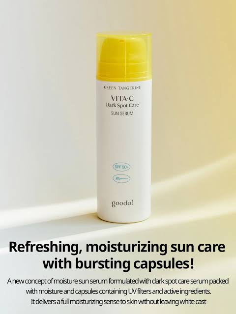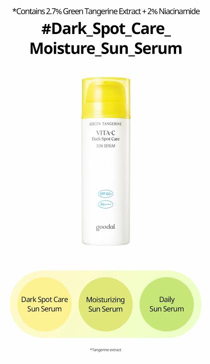 The Goodal Green Tangerine Vita C Dark Spot Sun Care Serum is a lightweight sun serum infused with Niacinamide, Green Tangerine Extract and Vitamin C. It provides SPF 50+ and PA++++ UV protection while actively brightening and moisturizing the skin.
