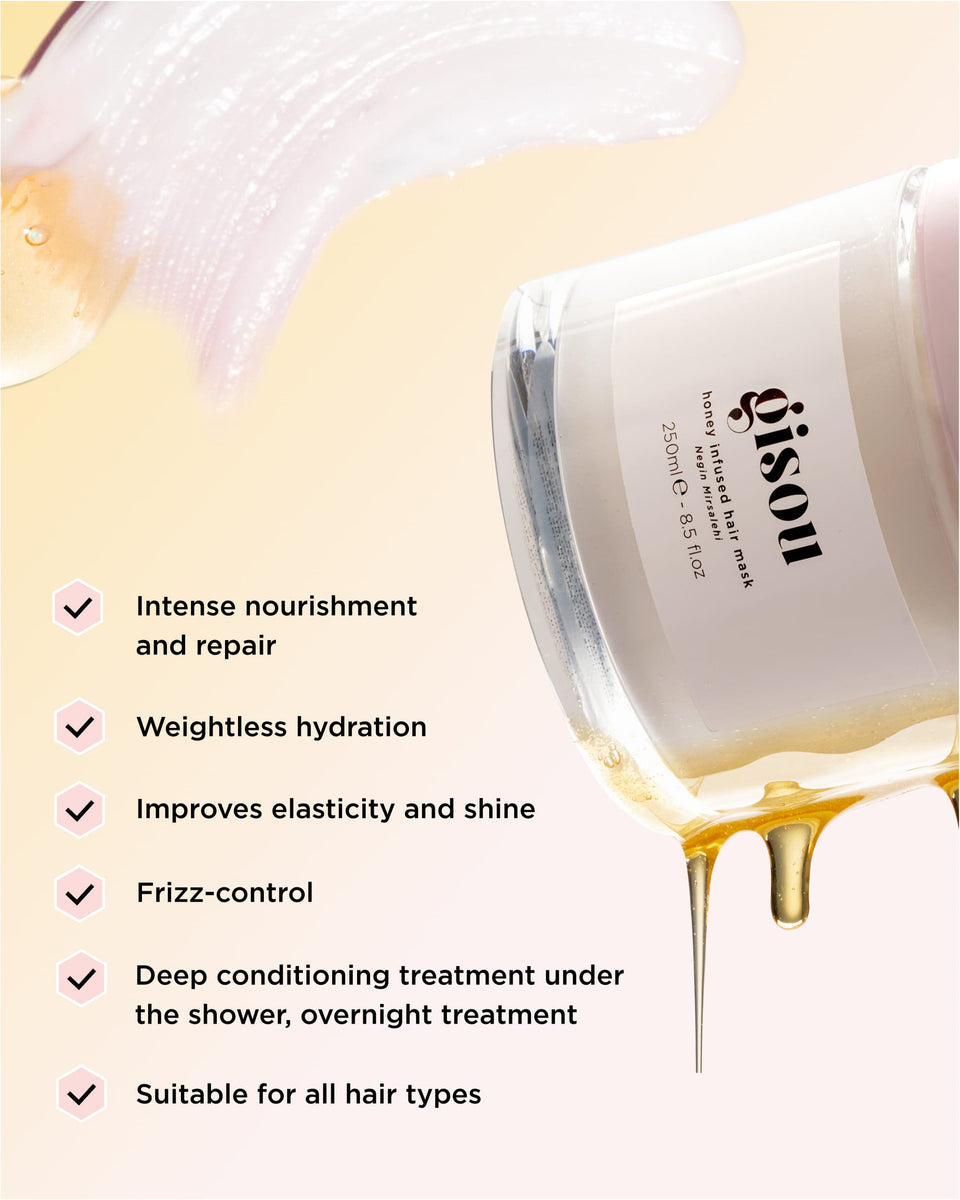 In just 5 minutes, the intensive nourishing Honey Infused Hair Mask, enriched with Mirsalehi Honey, works to deliver smooth, visibly hydrated hair while also deep-conditioning to enhance hair elasticity, shine, and overall health.