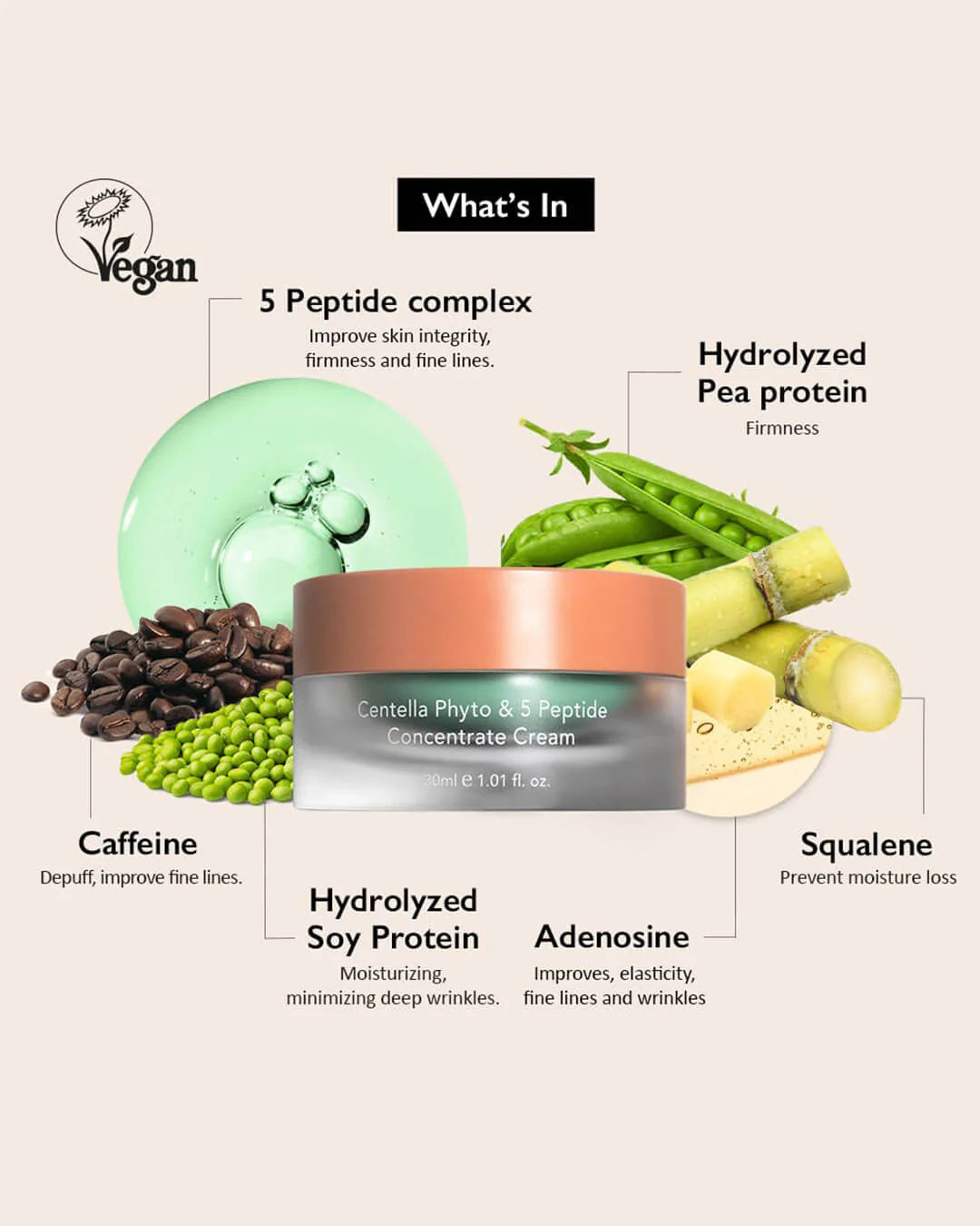 The Centella Phyto & 5 Peptide Concentrate Cream nourishes the skin barrier and boosts elasticity. A perfect all-in-one cream to target premature signs of aging & oxidative stress, leaving the skin with a healthy, radiant glow.