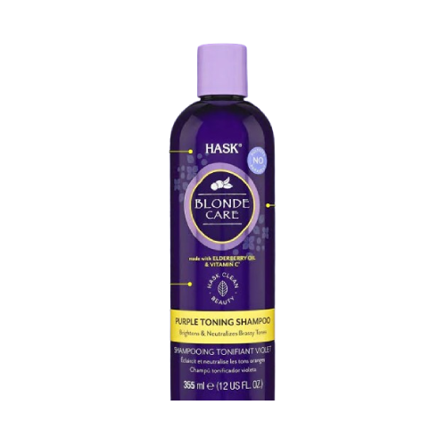 Cancel out unwanted warm, brassy tones with the HASK Blonde Care Purple Toning Shampoo. This highly pigmented, violet formula gently cleanses while neutralizing dull, yellow and brassy tones for a cooler shade of blonde. Enriched with a blend of elderberry oil and vitamin C* to help enhance shine, restore moisture and keep dry, damaged hair smooth and healthy-looking