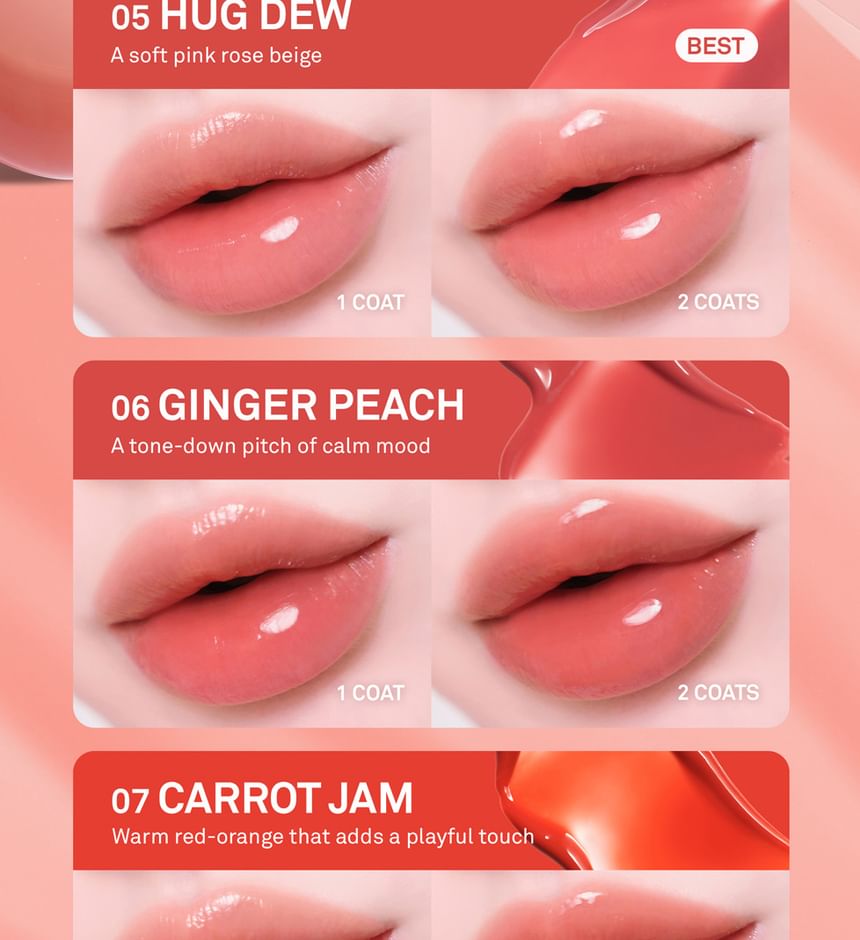 The melting balm texture smoothly melts upon application, creating a transparent and shimmering dew coating.