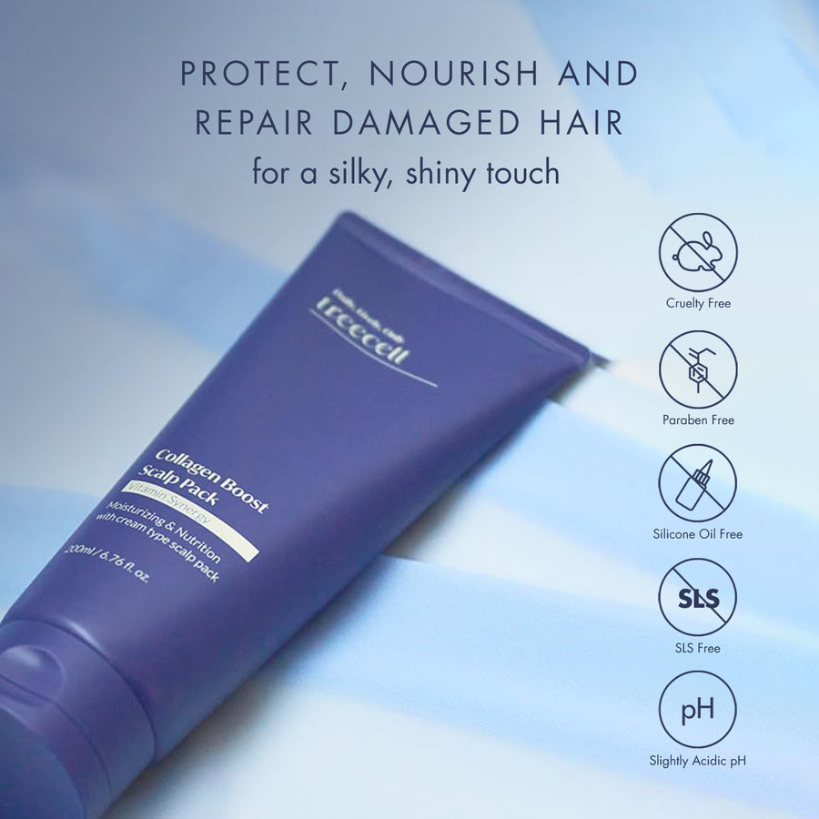 Hair that is healthy, lush, and full of life starts from the root. Introducing the Treecell Collagen Boost Scalp Pack, a luxurious cream formula designed to deeply nourish and repair your scalp and hair, leaving them feeling silky smooth, and healthy.