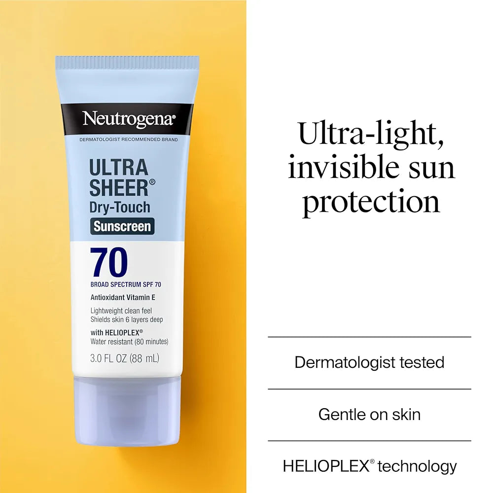 Neutrogena Ultra Sheer Dry-Touch Sunscreen with Broad Spectrum SPF 70 travel size sunscreen provides powerful sun protection that you will love to wear without the heavy finish. Featuring Avobenzone, Homosalate, Octisalate, Octocrylene as active ingredients, this non-greasy body sunscreen is oxybenzone free, Hawaii Act 104 compliant. With Helioplex technology to provide superior UVA/UVB protection from aging UVA rays and burning UVB rays. Enriched with antioxidant vitamin E, the lightweight SPF sun screen lotion with Dry-Touch technology absorbs fast for a clean, ultra-light feel and non-shiny finish. Lotion sunscreen formula is non-comedogenic and PABA-free. This Neutrogena sunscreen is water-resistant for up to 80 minutes and comes from a dermatologist recommended sun care brand. Apply prior to sun exposure to keep skin protected during outdoor activities like gardening, biking, hiking, boating or walking. Protect yourself as you get your daily dose of sunshine.