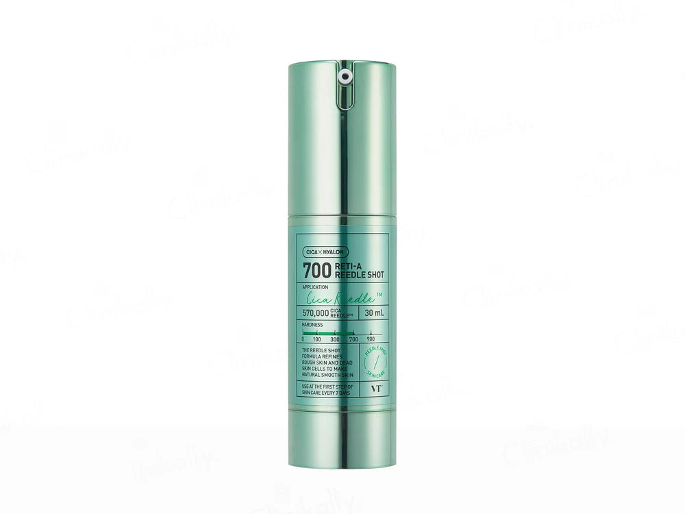 VT Cosmetics 700 Reti-A Reedle Shot is a high-strength weekly retinol care treatment formulated with cica reedle™ micro-needles, cicahyalon™, and vitamin a complex to refine texture, reduce fine lines, and smooth rough skin. with 570,000 cica reedles™ per bottle, VT Cosmetics 700 Reti-A Reedle Shot enhances delivery of actives deep into the skin for visible renewal. ideal for dull, textured, or aging skin, this intensive formula provides weekly exfoliation and rejuvenation without compromising skin comfort.