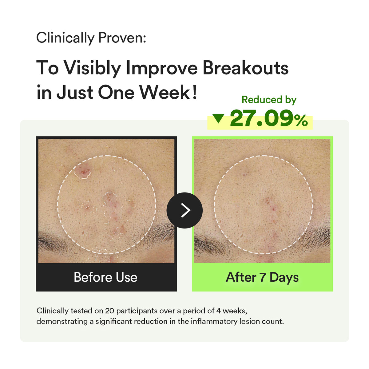 2. 7-Days Intensive Trouble Care: Clinically tested on 20 participants over a 4-week period, showing significant reductions in the count of inflammatory lesions.
