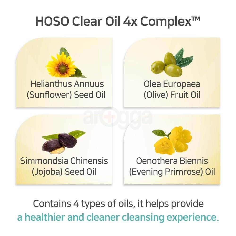 HOSO CLEAR OIL 4X COMPLEX: Contains Helianthus Annuus Seed Oil, Olea Europaea Fruit Oil, Simmondsia Chinensis Seed Oil, Oenothera Biennis Oil, it helps provide a healthier and cleaner cleansing experience.
