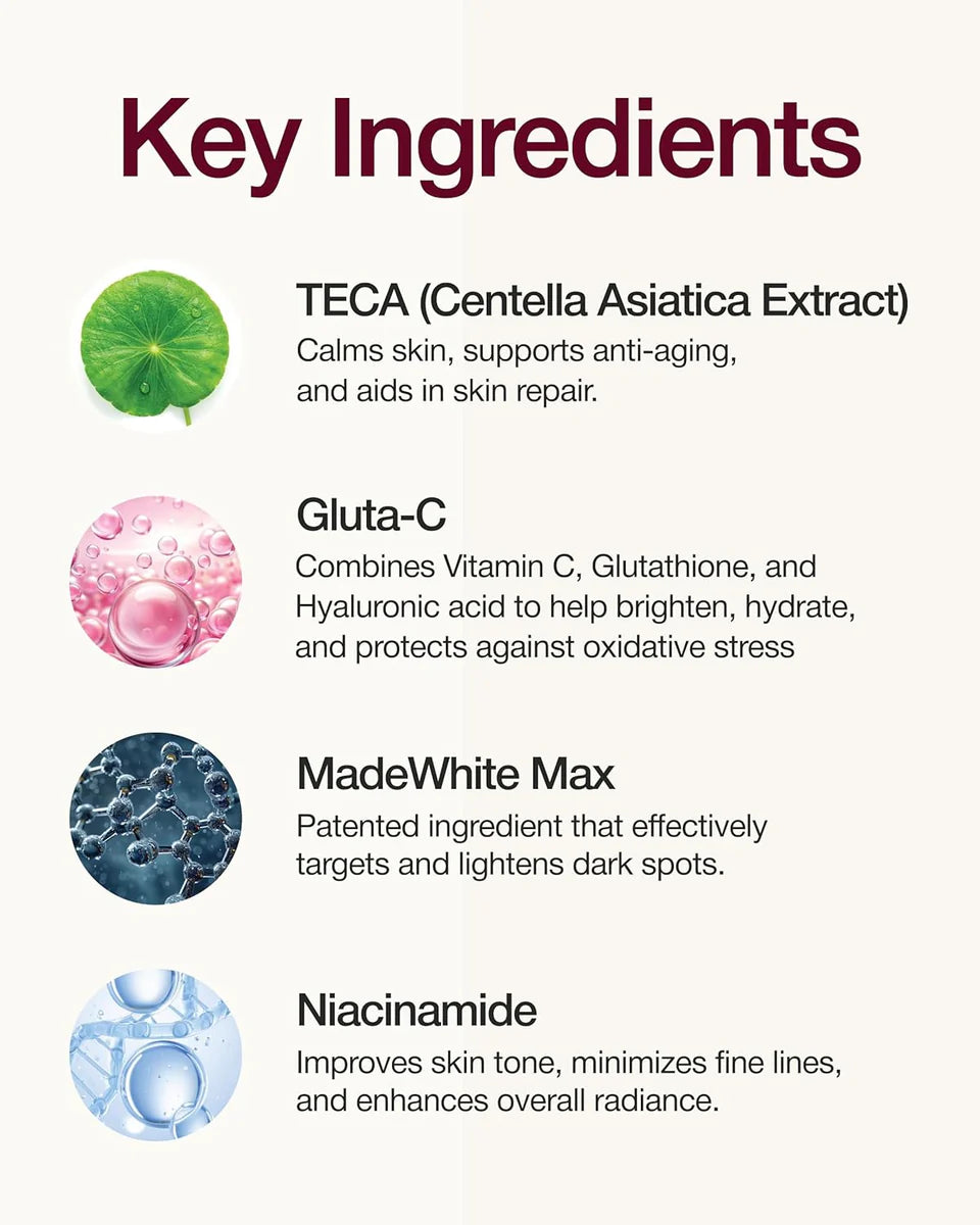 - Contains 30,000PPM of made white max obtained from centella asiatica.