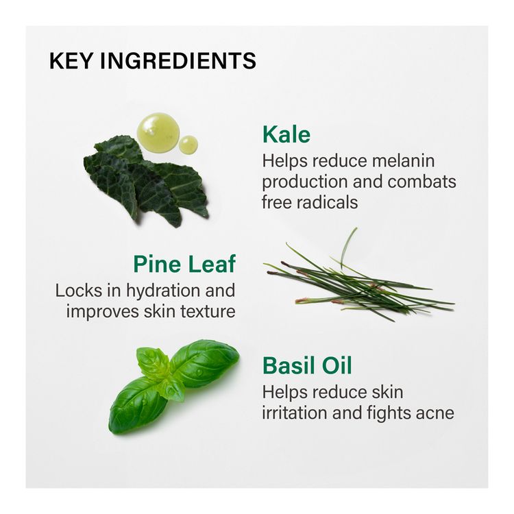 * Kale Extract: Replenishes and soothes dry skin. Leaves skin hydrated and visibly glowing. * Pine Leaf: Improves elasticity, skin's texture and evens skin tone. * Basil Oil: Nourishes the skin with abundant antioxidants