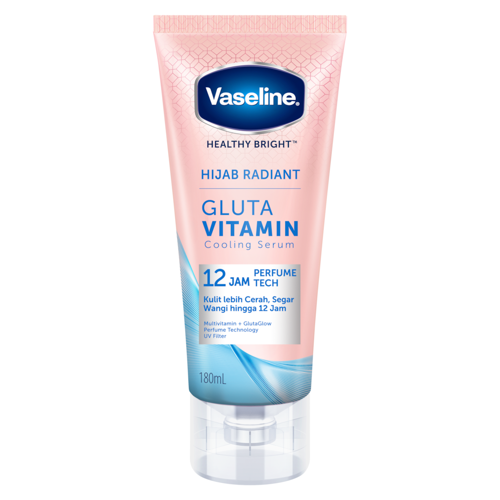 Vaseline® Hijab Radiant Gluta Vitamin Cooling Body Serum contains 10x multivitamin^: niacinamide, vitamin C & E to intensively nourish the skin for brighter, fresher and fragrant skin for up to 12 hours