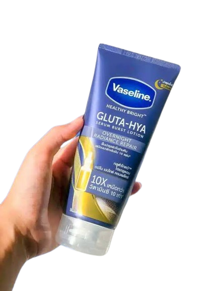 Vaseline Gluta - Hya Over Night Radiance Repair Serum Burst Body Lotion Has Gluta Glow, 10 times more effective than Vitamin C , helping to reduce the cause of dull skin , 10 Times Amino Peptide Complex revitalizes tired skin to look radiant. Vaseline Gluta Jelly helps lock moisture deep in the skin. Restores natural balance to your skin.