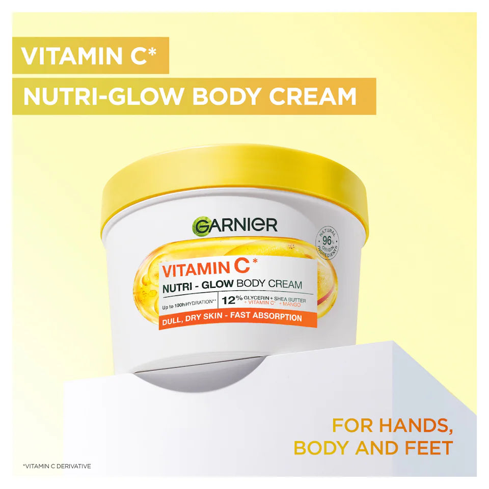 Garnier Vitamin C* Nutri - Glow Body Cream is formulated for dry, dull skin and enriched with ingredients such as Vitamin C* and Mango extract ! Mango extract is known for its richness in nutrients & Vitamin C* known for its brightening properties. This powerful cream leaves the skin feeling instantly hydrated, up to 10 cell layers deep**, for results you can feel and provides up to 100h hydration***. With 96% Natural Origin ingredients - this product is a vegan formula. All Garnier products globally are officially approved by Cruelty Free International under the Leaping Bunny Programme, the leading organisation working to end animal testing worldwide, and the recognised Cruelty Free Gold Standard. *Vitamin C derivative,**Up to cell layers of the stratum cornea,***Consumer study on 183 subjects, after 28 days